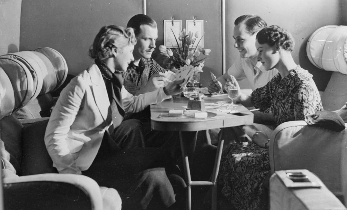 Passengers playing cards and drinking in the cabin of an Imperial Airways plane, 1936