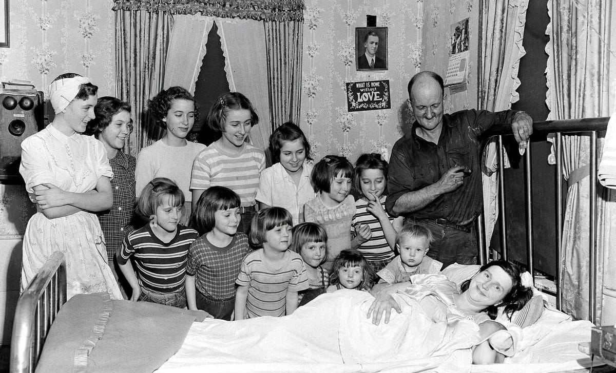 The Brooks family welcomes their only son, surrounded by his 13 sisters, 1954