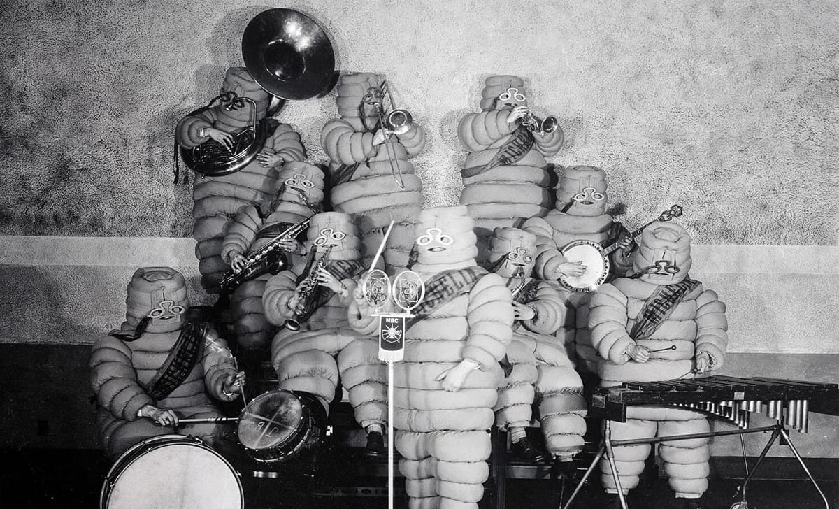 Odd, Scary, Unique Vintage Michelin Band performing at the launch of the "Michelin Hour" radio show, 1928